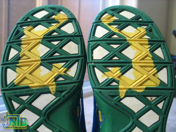 On Christmas Eve, we gave you an exclusive look at the Nike Zoom Soldier II Sprite Player Exclusive. Today, courtesy of oneonenine, we have some new photos for you. Featuring a bubble filled blue upper accented by a Green outsole and Yellow piping, this model references to LeBron James’ endorsement with Coca-Cola owned soda brand – Sprite. It’s the second Nike LeBron signature sneaker inspired by the popular drink. Couple years ago they did a Zoom LeBron III Low version. Don’t expect these shoes to pop up at the House of Hoops or anything, because they are as rare as they come.