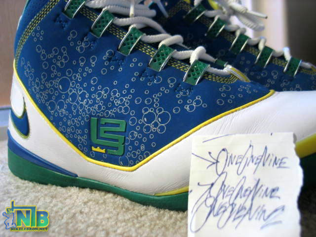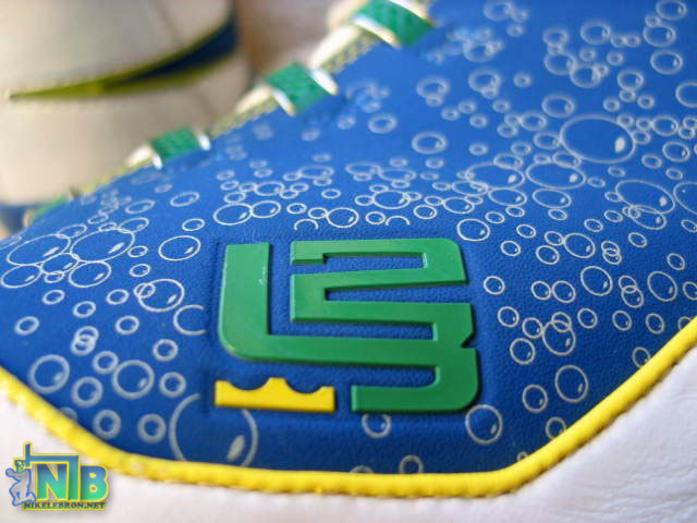 On Christmas Eve, we gave you an exclusive look at the Nike Zoom Soldier II Sprite Player Exclusive. Today, courtesy of oneonenine, we have some new photos for you. Featuring a bubble filled blue upper accented by a Green outsole and Yellow piping, this model references to LeBron James’ endorsement with Coca-Cola owned soda brand – Sprite. It’s the second Nike LeBron signature sneaker inspired by the popular drink. Couple years ago they did a Zoom LeBron III Low version. Don’t expect these shoes to pop up at the House of Hoops or anything, because they are as rare as they come.