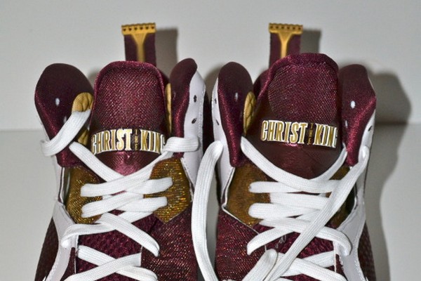 Last month we got a chance to preview this year’s Christ the King colorways of the Nike LeBron 9 on the very first pics that surfaced the Internet. Fortunately we’re upgrading from those blurry shots for a much better look. Unlike the Saint Vincent Saint Mary High School, which got both LeBron 9’s and Soldier 5’s for the season, the CTK Royals got only the 9’s for balling this season. The CTK Home colorway of the Nike LeBron 9 features a mix of White, Maroon and Gold on the upper with a speckled midsole and the “Christ the King” logo on the top of the tongue.