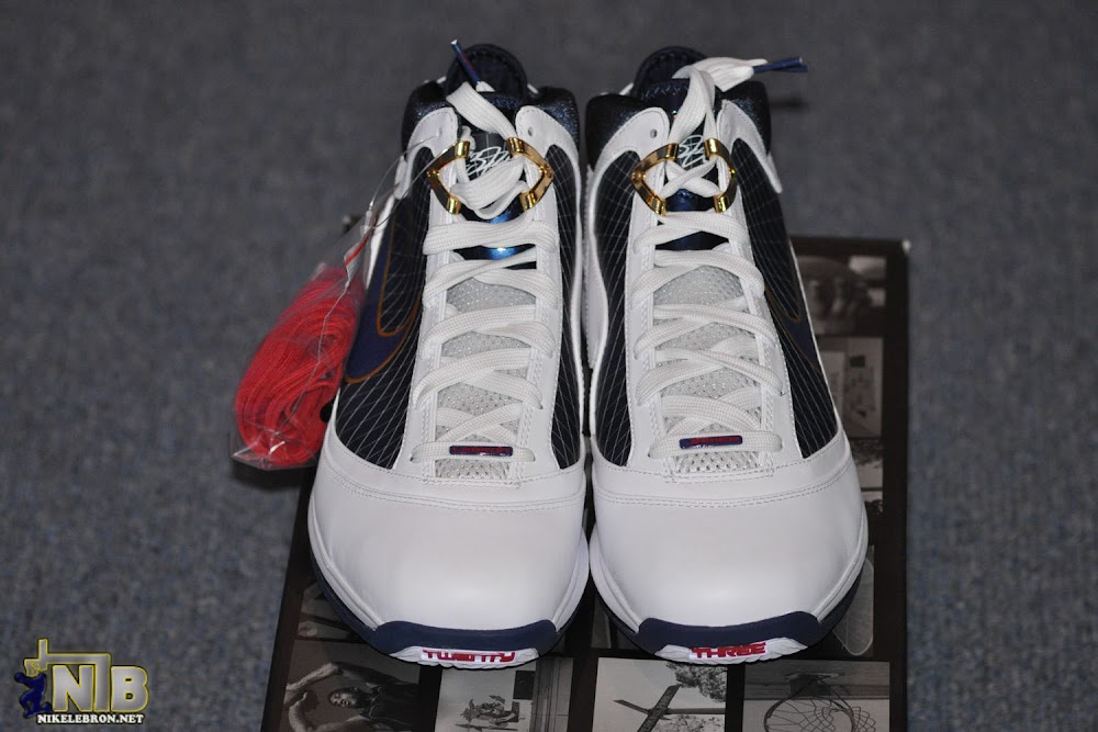 If you’re not satisfied with catalog pics floating online you’ve come to the right place. Here on NLB.net crispy photos are always a top priority. Couple days ago Nike released the second GR colorway of LeBron James’ latest signature shoe – Nike Air Max LeBron VII. Unlike the Black, White and Red, this new White and Navy style features the hologram decoder key on the outsole and comes with an additional set of red laces… just like the Red Carpets do. The most characteristic thing about them are seven red Flywire threads on the medial side of the shoe. Matching Cavs’ alternate unis and also Team USA native colors, the Navy colorway is always a favorite among fans. Check these new detailed photos thanks to Niketalk’s Jordan23 4xL.