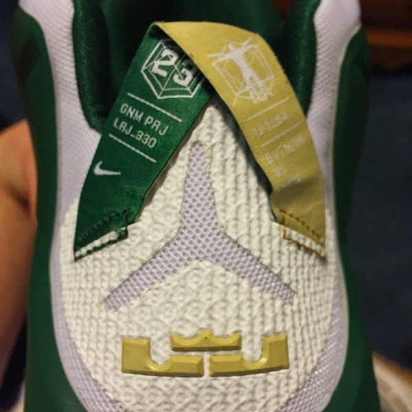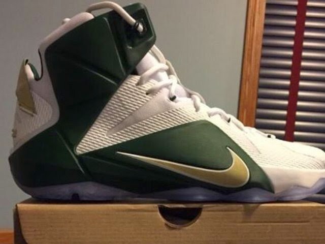 After finally bringing the SVSM’s back to LeBron James’ main signature line last year with a couple of great looking LeBron 11 SVSM PEs, we now get a chance to see the new installment… the SVSM 12’s. The Home edition, presented below, sports a white Megafuse upper and green Hyperposite panels and gold Nike LeBron branding with the mandatory translucent outsole below. It seems that unlike the collegiate LeBron XII PEs, the High School models don’t include any form of a shoutout on the heel pull-tab. The Fighting Irish logo is not present anywhere on the shoe, but don’t be fooled… it’s definitely not a NIKEiD design. Check out a couple of first look pics showing the Nike LeBron 12 SVSM Home PE that has recently popped up on eBay.