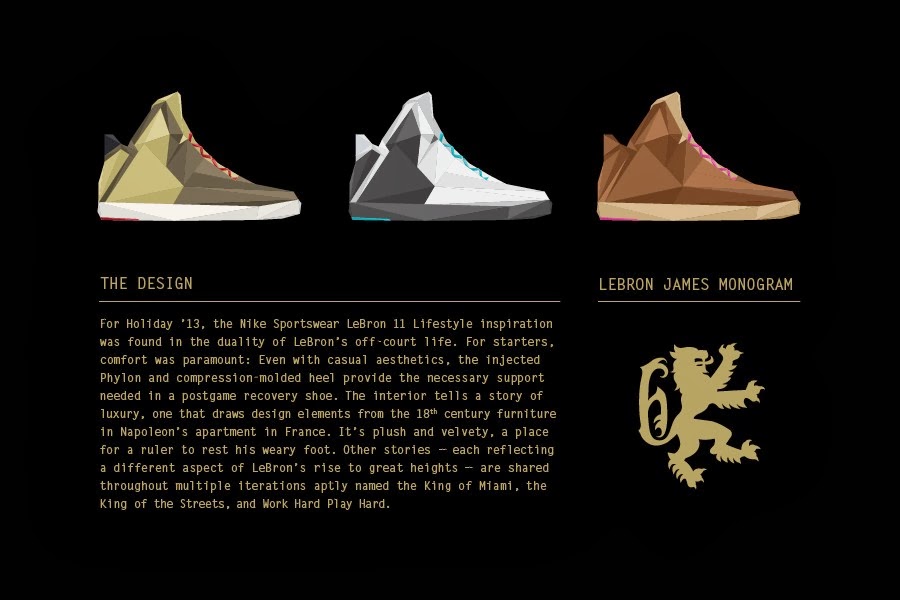 For Holiday ’13, the Nike Sportswear LEBRON 11 Lifestyle inspiration was found in the duality of James’ off-court life. For starters, comfort was paramount: even with casual aesthetics, the injected Phylon and compression-molded heel provide the necessary support needed in a post-game recovery shoe. The interior tells a story of luxury, one that draws design elements from the 18th century furniture in Napoleon’s apartment in France. It’s plush and velvety, a place for a ruler to rest his weary foot. Other stories? all reflecting James’ ability to rise to great heights while staying in touch with the community are shared throughout additional iterations aptly named the “King of Miami“, “King of the Streets“, and “Work Hard, Play Hard“. The LEBRON 11 Lifestyle will be available at your local Nike Sportswear retailer beginning Oct. 12. Let us know if you plan to add these to your collection.
