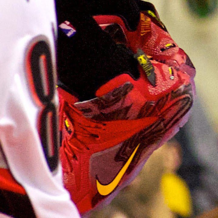 LeBron has a history of rocking special PE colorways marking his visits in Portland… where he’s very close to the Nike Global Headquarters and usually pulls out his sickest kicks. Last night was no different as James debuted a new predominantly red version of the Nike LeBron 12. Seems that he’s been playing comfortably in his latest signature shoe, which after last year’s mishap with the 11’s is the #1 topic among Nike LeBron fans. The “Portland” LeBron XII PE features a Red Megafuse upper, Yellow branding and Dark Red posite panels with special graphics similar to the design seen on the Six Meridians colorway.