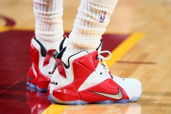 The recently updated 2014-15 shoes timeline includes all 14 different colorway of the Nike LeBron XII that were used by King James this year. This includes two General Release styles (Heart of a Lion, Data) and twelve different Player Exclusive versions. For tonight’s matchup vs. the Minnesota Timberwolves James laced up yet another LeBron 12 PE featuring a White based, Red posite section and Black trim. Basically, this is a Heart of a Lion in a negative. Obviously a translucent outsole, which is present in most LeBron 12’s, completes the look below. This puts the LeBron 12 (15 colorways / 28 wears) ahead of the LeBron 11 (14 colorways / 26 wears) and we’re only 26 games into the season!