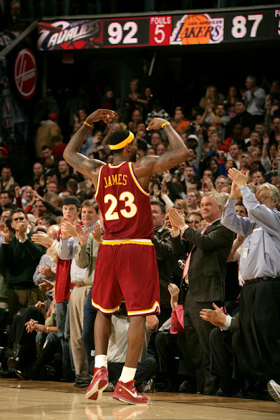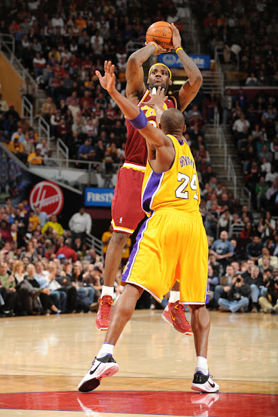 When LeBron James checks back into a ballgame in the fourth quarter, he and his teammates will exchange the universal baseball signal – tapping two fingers on the left forearm – to indicate that “The Closer” is entering the game. The reigning MVP played that role to perfection, extinguishing the Lakers’ run and willing the Wine and Gold past the World Champs – 93-87 – on Thursday night at The Q. Cleveland showed its Christmas Day win over Los Angeles was no gift as James scored 37 points, including 12 straight down the stretch. In a matchup of the game’s two best players, it was LeBron who emerged victorious for the second time this season. “I don’t want to look too far into beating one team twice,” reasoned James. “The Championship still goes through L.A. It doesn’t matter if you beat the team four times; you still have to beat them in the Finals to take that trophy away from them.” Kobe Bryant finished with 31 points and became the youngest player to reach 25,000 points for a career. Continue reading for numerous game photos. Still, no close ups of the CavFanatic LeBron VII’s.