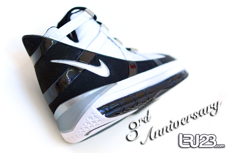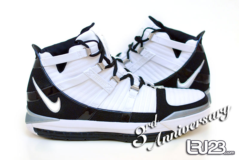LeBron James’ favorite football team is the Dallas Cowboys, but what we’re looking at is the Nike Zoom LeBron III in what seems to be an Oakland Raiders colorway. Even if that’s not the true inspiration, it’s the first time for this White/Black/Silver make up to appear online. We definitely didn’t get enough of the III’s released to public. The nicest styles were left as PEs/Samples. See the complete listing of Nike LeBron 3’s.