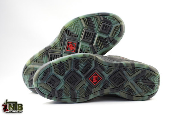 The Camo ZS3 might not be as glamorous as other Soldiers available on the market – GR, POP, and Dunkman – but don’t overlook its universal application. It continues the newly established tradition of releasing LeBron Soldier shoes in a truly Soldier (or rather Army) make up. At first (Soldier I), it was a very limited drop at Solebar’s opening, but last year (Soldier II) the Camo theme became more available (House of Hoops, Nikestore.com). The third installment, though, is a regular widely-available General Release. So if you dig this Black, Olive, and Red design featuring a translucent outsole check out eastbay or NDC or PYS.com. Also, They’ve got some Army-colored apparel to go with the shoes. Remember… you might encounter sample pics on those sites, but the actual product looks like this…