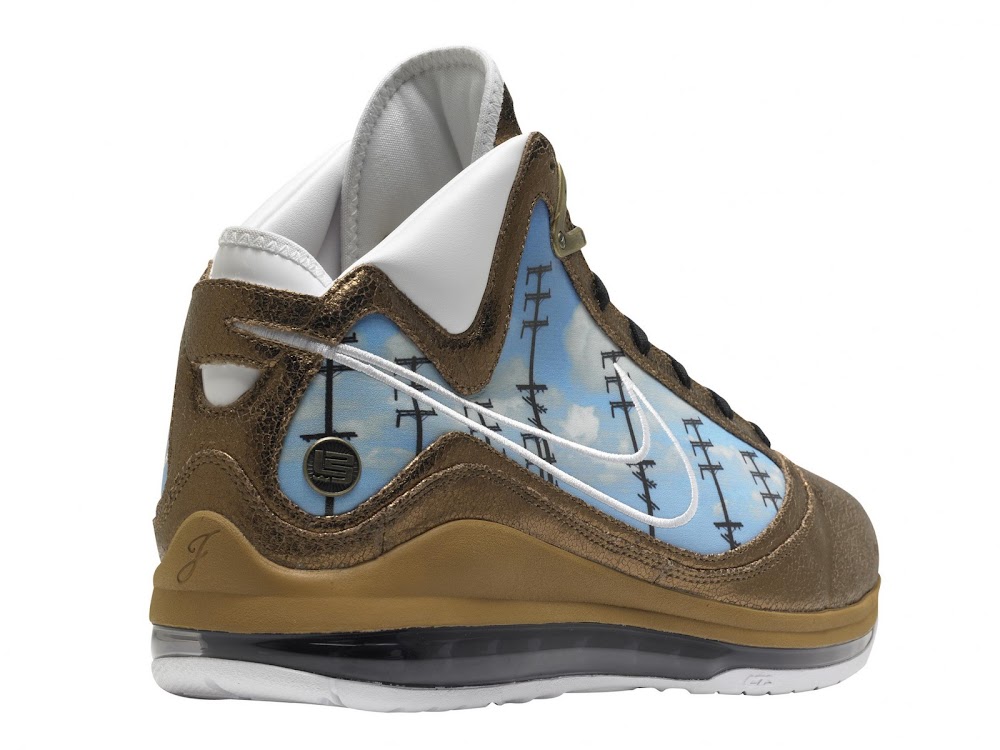 Today, at a presentation that took place during Nike’s grassroots activities in Los Angeles, C.R. Stecyk III gave James an uniquely designed pair of Air Max LeBron VII shoes. Stecyk took his inspiration for the one-of-a-kind shoes from the city of Los Angeles, paying homage to the new monuments of urban shift in the city. The multiplicities of LA are reflected on the surfaces of the shoe. It is clad in colors derived from the region’s natural hues such as the incandescent blues of the sky and the rich rusty bronze of the clay soil of the Pueblo. Sole theatrics can be glimpsed on the inside where a hand engraved metallic plate view of Los Angeles City Hall is located as a symbolic tribute to the city’s center. Unique elements of the extended city such as the palm trees and telephone poles which sometimes function as basketball standards can be viewed on the exterior. “There are countless thousands of places to shoot hoops that range from makeshift defacto rims to full blown arenas,” said Stecyk, adding, “Basketball is an integral fact of the populace’s life — in LA it is literally the sport of the people.”