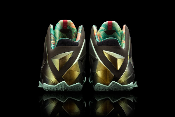 The number 11 represents new beginnings and is a step beyond a celebrated tenure. Starting his 11th year in the league, with two gold medals, two championship rings and four MVP trophies, LeBron James continues to succeed by constantly improving his game. Designed to provide a protective suit for James’s unique style of play, the LEBRON 11 encompasses the duality of powerful precision. It is James’s lightest signature shoe to-date, while offering the protective feel, responsiveness and containment his game requires. The presented King’s Pride colorway draws inspiration from the lion – its Dark Loden upper color and the floral print on the collar lining reflect the pride of the wildlife. The “King’s Pride” Nike LeBron XI, also knows as the Parachute Gold colorway, will be available on October 12th, 2013 globally for $200.