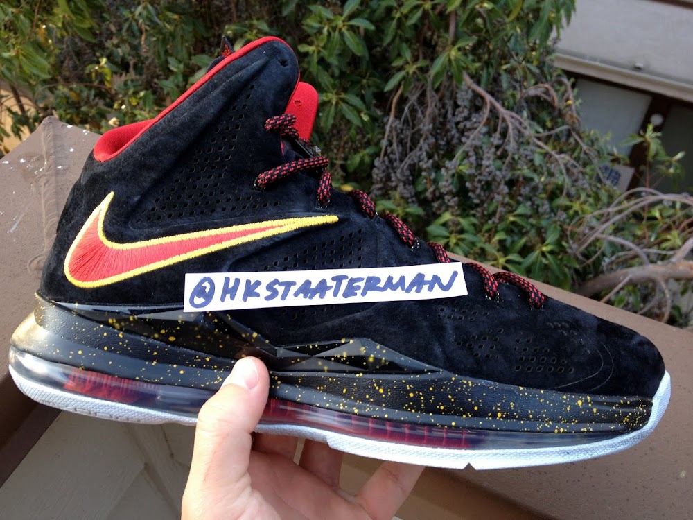 We continue our coverage of the Nike Sportswear branch of the Nike LeBron X signature collection. Following the overview of the Red Suedes is this new Black Suede colorway. The new version sports the classic Miami Heat look with Black upper, clean White outsole and Red / Yellow accents throughout the shoe. It is slightly different from the LeBron James’ Player Exclusive (also pictured below) mainly due to the Yellow swoosh outline. Similar to the Red Suede, the Black Suede LeBron X EXT features the Nike Plus Basketball capabilities. Rumor has it that apart from the Hazelnuts and Denims a Black pair is actually coming out. Will it be this pair? Time will tell. Big thanks to @hkstaaterman for sharing his pics!