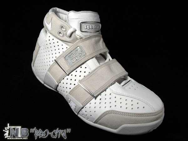We expressed our warm feelings towards the 20-5-5’s last week when we profiled the Navy Playoff PE. In order to put an emphasis on this special shoe we’ve prepared one more feature… yet another Player Exclusive version of the twenty-five-five. This time it’s one of the Pro-City Special Make Ups, which were created for Nike’s Summer Basketball League back in 2005/2006. There are several versions of these kicks. Both colorways and logos representing each city are what sets them apart. As for the styles involved there is either White/Black/Silver or White/Neutral Grey. Known Pro City Nike Zoom 20-5-5 customizations include: New York, San Francisco, Los Angeles, Chicago, Minnesota. Too bad Nike’s energy releases like for example House of Hoops Exclusives weren’t possible back when the 20-5-5’s had ruled the courts. It would be very interesting too see some new colorways, that’s for sure. Although the Soldier line has picked up where the 20-5-5’s left off… maybe we will see another successor of the first Nike LeBron summer shoe… possibly something called 30-7-7. Or maybe Nike is waiting for that 30-10-10 season from King James. At this rate of his improvement… it might happen very soon :D. Anyway… enjoy couple new pics after the break. Shout out to dOubleO, who contributed to our site by donating this amazing pair of shoes. Thank you!