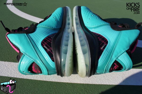 I’m pretty sure these shoes need no reminder, but with only a couple hours left till the official drop, let’s take yet another look at the South Beach Nike Air Max LeBron 8. Initially released last month at selected accounts in Miami area, however, starting tomorrow the Pre-heats start their expansion outside of Miami. The South Beach 8’s will be available at Nike Quickstrike accounts, House of Hoops location, several Footaction stores and online at eastbay.com and nikestore.com (midnight). The quantity remains unknown, but they are indeed very limited, so be sure to place your order as soon as possible. In the meantime… batch of new photos after the break.