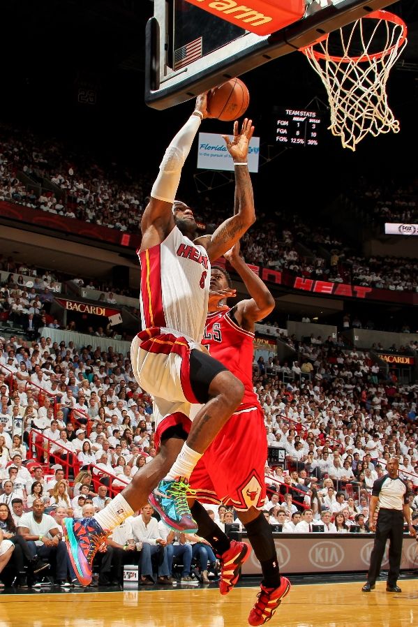 After being handed his fourth MVP trophy by commissioner David Stern, LeBron James went back to work finding open shooters and puncturing the opposing defense. Only one problem: No one could hit their shots, James included. That is, until the fourth quarter began. James came alive in the fourth with huge buckets early, but then Nate Robinson happened. He scored a game-high 27 points to lead the Chicago Bulls to a 93-86 victory against the Miami Heat Monday in Game 1 of the Eastern Conferencel semifinals. James had 24 points on 8-of-17 shooting but was held in check for the first three quarters. LBJ started the game wearing his brand new MVP shoes that he described as his style kicks, but then switched for the Post Season version of the Nike LeBron X, which according to The King are much lighter and build for faster speeds. Continue reading for a detailed look and check out his previous MVP looks.