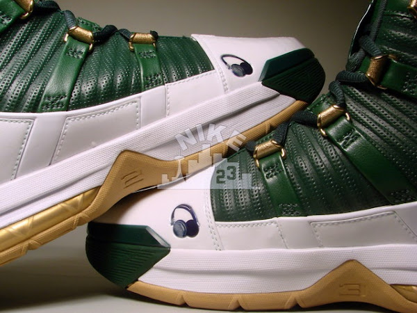 These shoes, one of four LeBron Nike Zoom III colorways that represent a character in the “LeBrons” commercials, reflect Kid LeBron’s animated personality. A play on LeBron’s youth compared to other NBA players, he is a youngster just looking to have fun. The Kid ZLIII features SVSM-like colors, which also corresponds with James’ childhood. Click the ‘Read the rest of this entry’ link to see more photos or go here for more angles.