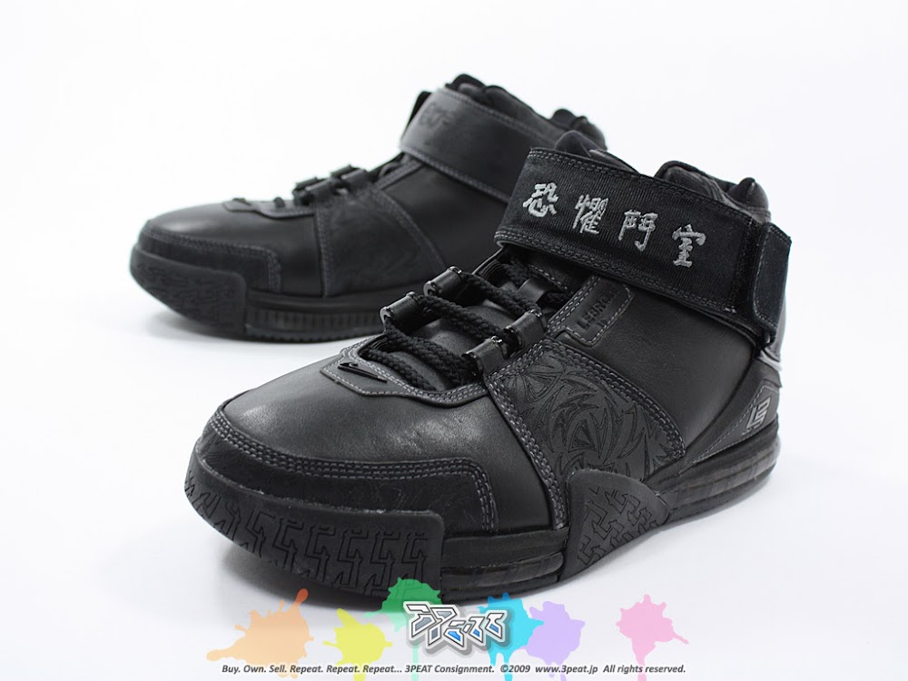 The “Chamber of Fear” campaign was not only created to promote the super limited Nike AF1’s personalized exclusively for LeBron James, but also there were some crazy colorways of the Nike Zoom LeBron II. In case you need a reminder check out one of our previous posts regarding this subject, for example: ZLII COF White/Red PE and ZLII Low Haters PE. LeBron wore the White/Red and White/Navy LBJ2 COF PEs several times during the 2004-2005 NBA Season, but there’s also an all black version of the shoe. It’s reminiscent of the Birthday Exclusive with a special Chamber of Fear strap, but in fact those are two different shoes (notice the promo tags). Actually, you can see all known ZLII COF variations in the Zoom LeBron II Listing. Click the title to see more photos.