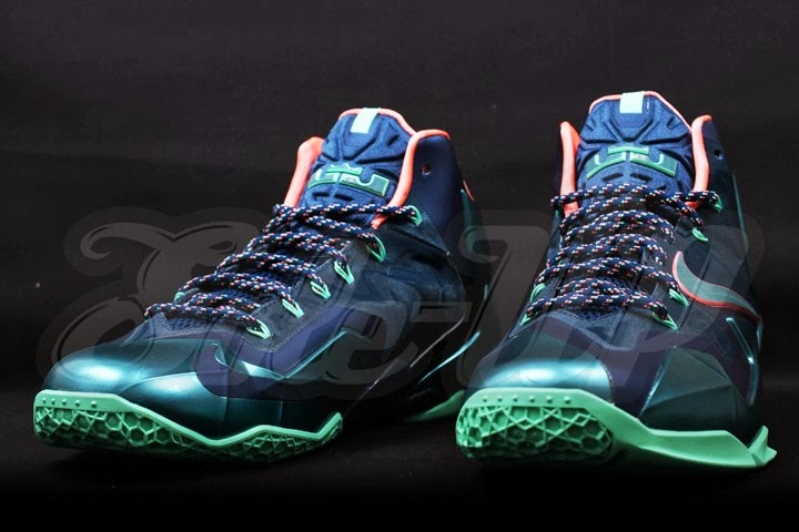 In a couple of weeks, Nike Basketball will be paying a tribute to two cities LeBron James calls home… Miami, Florida and Akron, Ohio with the release of a special Nike LeBron XI colorway dubbed as the Akron vs. Miami. The shoes feature an unique colorway, which combines Brave Blue, Green Glow, Mineral Teal, and Atomic Pink. Here’s another set of pics. I guess we will have to check these out in person because each time I see these kicks it’s a different look. I’m still not sure whether it’s Pink or Orange or whether the outsole has been copied from the King’s Pride or not. The “Akron vs. Miami” LEBRON 11 comes out on December 7th, 2013.
