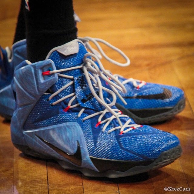 Over the past few weeks we’ve seen a couple of interesting LeBron 12 sightings in the NBA… some were Nike iD… some were regular GR colorways. Thanks to unofficial NBA feet photographer @geminikeez we now get a closer look at Nerlens Noel’s LeBron XII iD, who used the Instinct graphic option for his very own Philadelphia 76ers style. The shoe combines different shades of blue adding black and red details and a rare dark translucent outsole. Who rocks his Blue and Red LeBrons better? Nerlens Noel or Demarre Carroll?